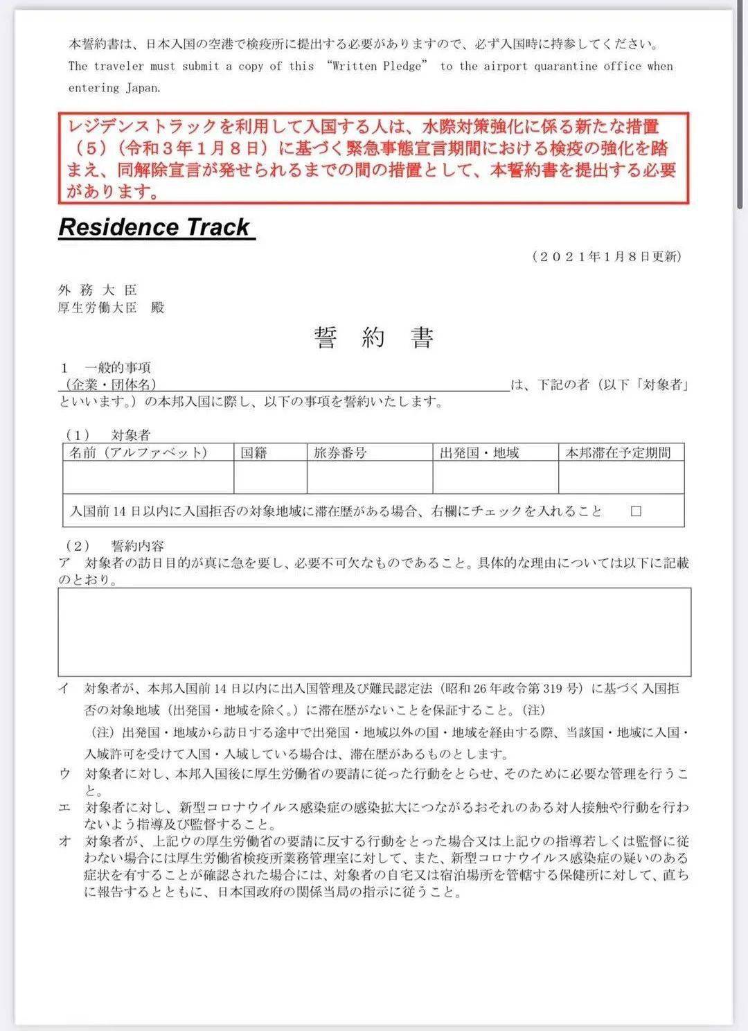下圖是日本新發(fā)布2021年1月8日最新版誓約書。
