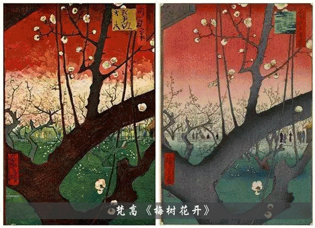 梵高《開花的梅樹》(右)上日文為 龜戶梅屋,吉原區一家花花酒館的宣傳