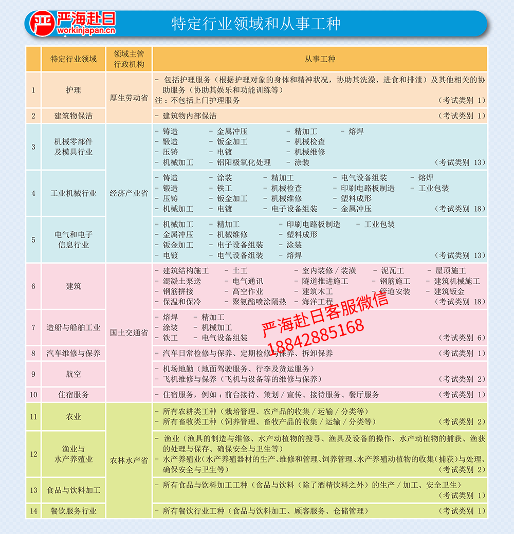 日本“特定技能”簽證有14大工種,詳細包括: