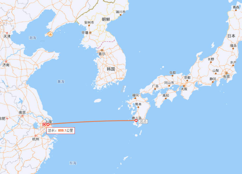 日本主島距離中國大陸比較近的地方是:鹿兒島-上海,大約800多公里。