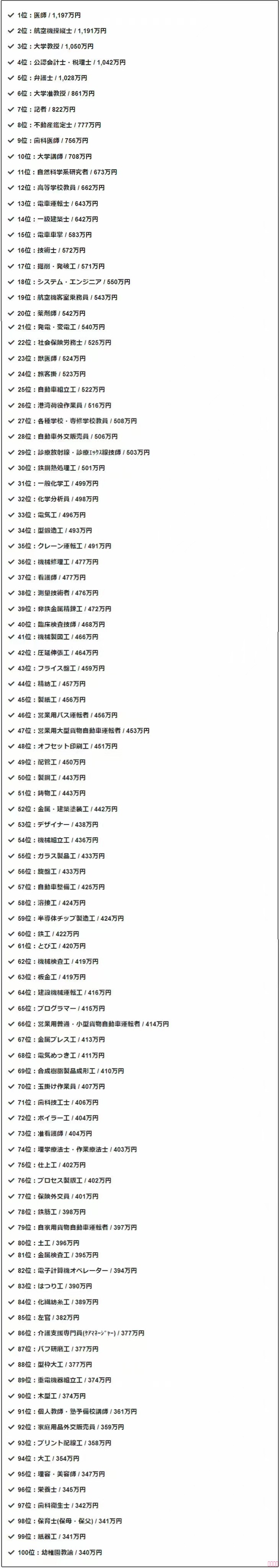 另外,日本哪個(gè)職業(yè)賺錢多,列個(gè)表給大家參考一下。