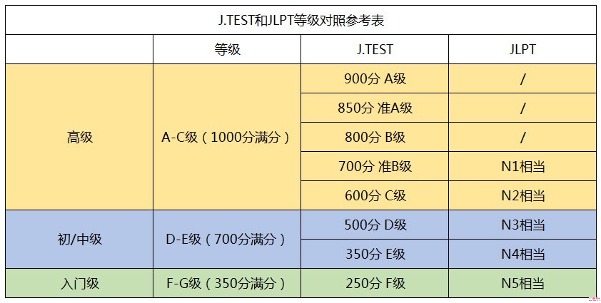 J.TEST:實用日語鑒定,分A級、準A級、B級、準B級、C級、D級、E級和F級,A級最高。