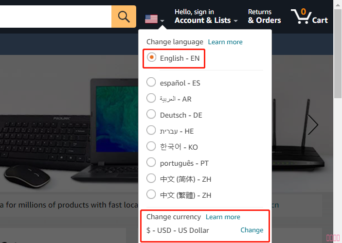 3、如果頁面默認(rèn)語言不是中文看不懂,可以在首頁右上角國旗標(biāo)志,點擊切換語言和結(jié)算貨幣。