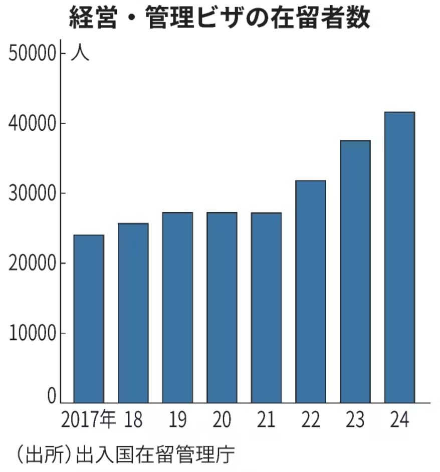 2014年,日本修改了《入管法》,將先前的“投資者/管理”簽證改為“經(jīng)營管理”簽證,目的是鼓勵(lì)外國人在日本創(chuàng)業(yè),振興經(jīng)濟(jì),實(shí)現(xiàn)技術(shù)和服務(wù)的多樣化。到2024年,持經(jīng)營簽證在日本居留的外國人數(shù)將達(dá)到約4.1萬人,比五年前增加50%。