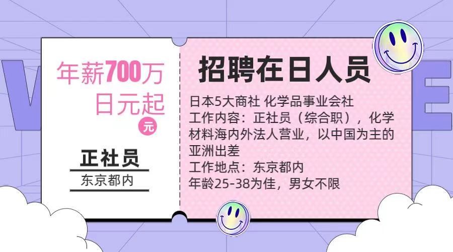 年薪700w日元起公司:日本5大商社 化學品事業公司(母公司全資子公司)工作內容:正社員(綜合職),化學材料海內外法人營業,以中國為主的亞洲出差工作地點&待遇:東京都內,初年年收700萬起,應商談要求:有制造業或商社的營業,25-38為佳,男女不限