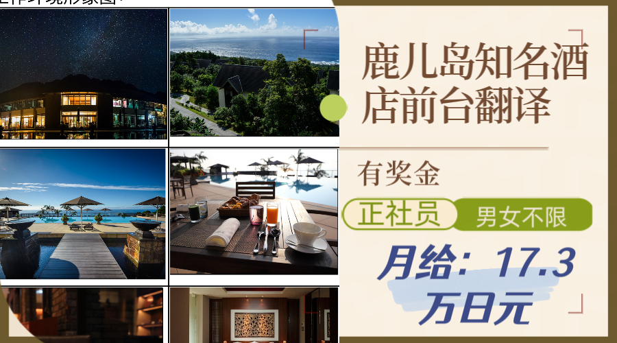 【工作特性】工作內容:酒店前臺翻譯,辦理入住,退房手續,電話對應,酒店內設施介紹引導等工作。工作地點:世界自然遺產屋久島(鹿兒島)簽證類型:日本技術?人文知識?國際業務簽證(可長期續簽,可申請永駐) 【福利待遇】1、工 資:正社員,大學學歷基本給19萬日元,大專學歷基本給17.3萬日元,2、加班補貼:有,1.25倍3、工作時間:8小時工作,排班制,月休7-8天左右。4、通勤補貼:有,上限2萬